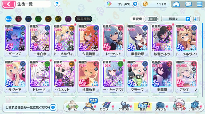 手持ちキャラはこんな感じで、LRまで進んだキャラが8人います。