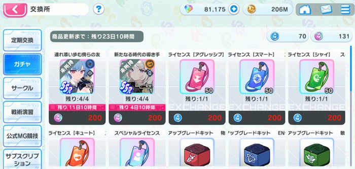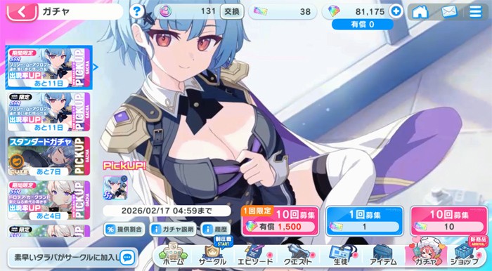 現状、ピックアップポイントが131で、ピックアップガチャチケットが38枚、石は81,175個。